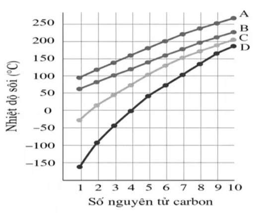 Câu 15. Đồ thị hình bên mô tả sự phụ thuộc giá trị nhiệt độ sôi vào số nguyên tử carbon của bốn loại hợp chất alkane, alcohol, aldehyde và carboxylic acid. Đồ thị A, B, C, D lần lượt tương ứng với các loại hợp chất là: