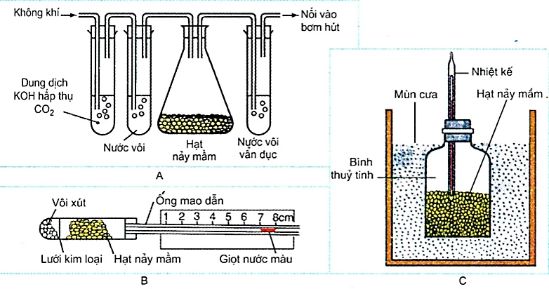 II. Trong thí nghiệm A, dung dịch KOH sẽ hấp thu CO2 được giải phóng từ quá trình hô hấp của hạt nảy mầm.