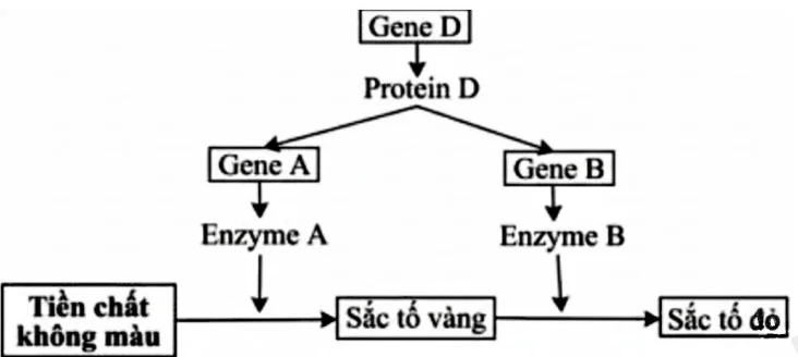 Câu 2: Ở một loài thực vật, sự hình thành màu hoa chịu sự chi phối của 3 locus A, B và D. Gene D tổng hợp ra protein D, khi có protein này thì các gene A và B mới có thể tạo ra enzyme có hoạt tính. Các enzyme A và B sẽ tham gia vào con đường tổng hợp sắc tố cánh hoa như sơ đồ sau: