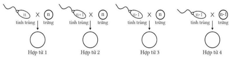 Câu 1: Hình dưới mô tả cơ chế hình thành hợp tử từ các giao tử đực và cái, hợp tử nào sẽ hình thành thể đột biến thể ba?
