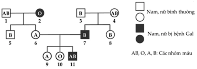 Câu 2: Phả hệ sau mô tả sự di truyền của tính trạng nhóm máu hệ ABO và bệnh rối loạn chuyển hóa galactose (gọi tắt là Gal) trong một gia đình. Biết rằng, bệnh Gal do một allele đột biến lặn gây ra, allele trội tương ứng quy định kiểu hình bình thường, gene quy định nhóm máu hệ ABO và gene gây bệnh Gal cùng liên kết trên NST số 9 của người. Người số 1 trong phả hệ không mang allele bệnh Gal.