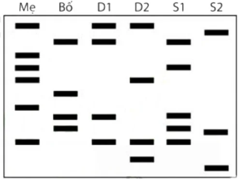 Câu 5: Một người đàn ông trong một gia đình nghi ngờ về huyết thống những đứa con nên đã tiến hành xét nghiệm DNA. Kết quả thu được như dưới đây (các băng cùng một hàng ngang thể hiện kích thước băng bằng nhau).