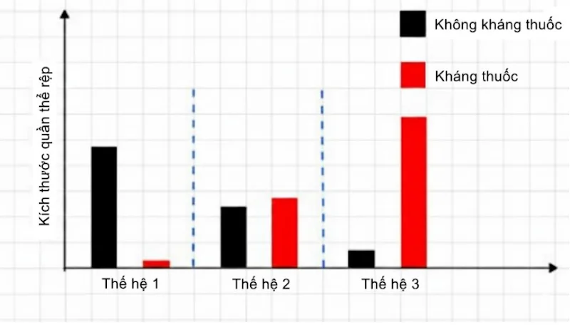 Câu 3: Một nông dân trồng khoai tây sử dụng thuốc trừ sâu nhiều lần để phòng rệp trong khoảng thời gian hai năm. Biểu đồ ở hình sau thể hiện các mẫu của ba thế hệ kháng thuốc trừ sâu và không kháng thuốc trừ sâu trong khoảng thời gian này.