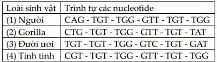 Câu 3: Để xác định quan hệ họ hàng giữa loài người và một số loài linh trưởng, các nhà khoa học đã phân tích một đoạn trình tự nucleotide trên mạch khuôn của một gene mã hóa cấu trúc nhóm enzyme dehydrogenase như trong bảng sau. Xác định thứ tự các loài (gồm 4 số) thể hiện sự giảm dần mức độ gần gũi về nguồn gốc giữa người với một số loài thuộc Bộ Linh trưởng?
