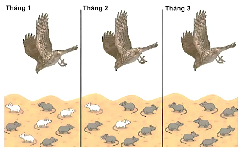 Câu 16: Hình vẽ bên mô tả quá trình săn mồi của một con diều hâu trong 3 tháng ở một quần thể chuột. Sự thay đổi trong quần thể chuột có thể được giải thích hợp lí bằng
