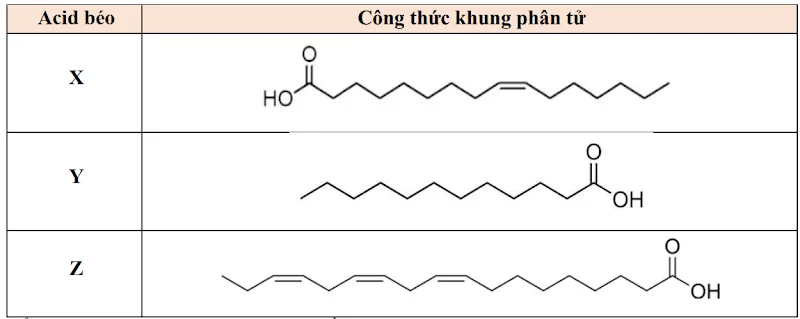 Câu 2: Triester E được tạo thành từ 3 acid béo là lauric acid (12:0, nghĩa là lauric acid chứa 12 carbon, 0 liên kết đôi C=C), linolenic acid (18:3) và palmitoleic acid (16:1). Cho bảng thông tin sau: