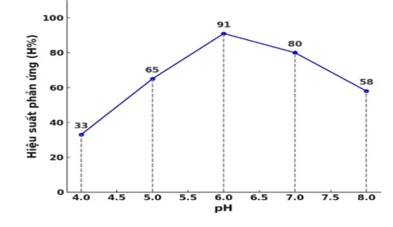 c) Trong các môi trường pH đã thử nghiệm, hiệu suất phản ứng đạt cao nhất ở pH = 6,5.