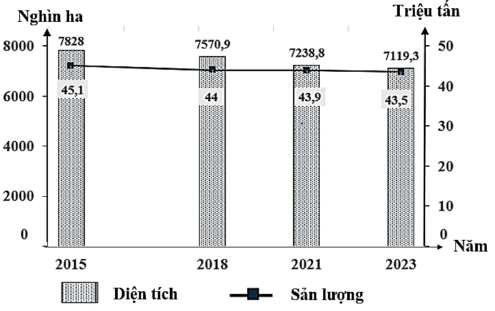 Diện tích gieo trồng và sản lượng lúa của nước ta, giai đoạn 2015 - 2023