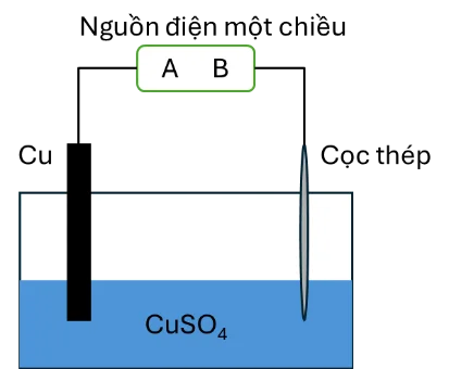 Câu 2. Cọc tiếp đất là một thanh kim loại được chôn sâu dưới đất và có tác dụng dẫn các dòng xung của tia sét xuống đất nhằm bảo vệ tính mạng con người và tránh hư hỏng cho các thiết bị điện tử. Một trong những loại cọc tiếp đất phổ biến hiện nay được sản xuất bằng cách mạ đồng lên cọc thép. Dưới đây là hình mô phòng cho quá trình mạ điện trên.