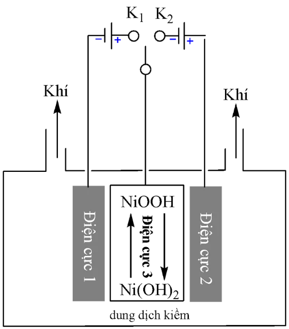 Câu 3. Một công ty sản xuất khí hydrogen có độ tinh khiết cao bằng cách điện phân nước theo phương pháp điện phân nước hai bước dựa trên hệ thống ba điện cực, sử dụng điện cực hydroxide nickel. Bằng cách điều khiển công tắc kết nối với K1 hoặc K2, có thể luân phiên thu được H2 và O2. Nguyên lý hoạt động như sau: