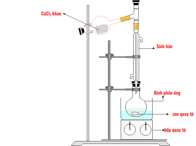 2. Lắp bình cầu với sinh hàn làm mát bằng nước và ống sấy chứa đầy CaCl2, rồi đặt thiết bị lên bếp (có quay từ) như minh họa.