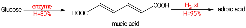 Câu 2. Adipic acid là hóa chất quan trọng được dùng trong sản xuất vải sợi (nylon-6,6) và nhiều sản phẩm thông dụng khác như thảm, dây thừng hay lông bàn chải đánh răng. Các nhà nghiên cứu thuộc Viện Công nghệ sinh học và Công nghệ Nano (IBN) của Singapore vừa phát hiện một sơ đồ hóa học mới có thể chuyển hóa đường glucose thành adipic acid như sau: