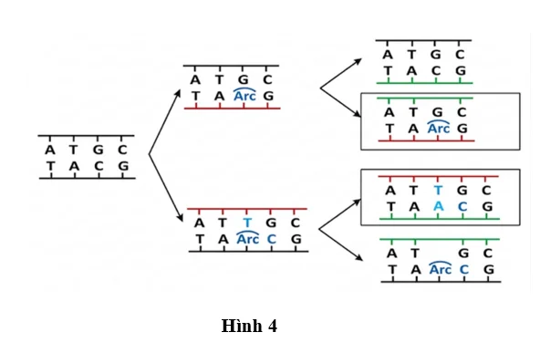 Câu 8. Quan sát Hình 4 mô tả cơ chế tác động của tác nhân đột biến Acridin (Arc) lên phân tử DNA đang nhân đôi. Phát biểu nào sau đây là đúng khi nói về kết quả của các cơ chế này?