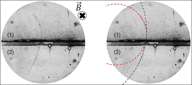 Để quan sát quỹ đạo của các hạt nhỏ như electron, các nhà vật lý đã sử dụng một thiết bị gọi là buồng mây. Khi một hạt bay qua buồng mây, các nhà vật lý có thể quan sát được quỹ đạo của chúng. Hình 2 (bên trái) là ảnh chụp quỹ đạo của một hạt (vệt cong màu đen) khi bay vào buồng mây và xuyên qua tấm chì mỏng ở giữa. Tấm chì có hai mặt là (1) và (2) như trong hình. Từ trường có chiều như hình vẽ. Điện trường bằng không. Biết rằng vệt cong màu đen là hai cung tròn liên tiếp nhau, có bán kính khác nhau. Hình bên phải (nét đứt) là hai phần cung tròn chứa hai phần quỹ đạo của hạt trước và sau khi bay qua tấm chì.