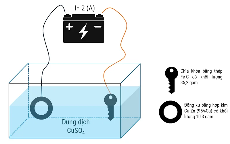 Câu 2. Một nhóm học sinh muốn sử dụng phương pháp điện phân để mạ đồng (copper) cho chiếc chìa khóa làm bằng thép (hợp kim Fe-C). Nhóm học sinh đã lấy một đồng xu bằng hợp kim Cu - Zn chứa khoảng 95% đồng về khối lượng; chuẩn bị dung dịch điện phân là 300mL dung dịch copper (II) sulfate 0,5M.