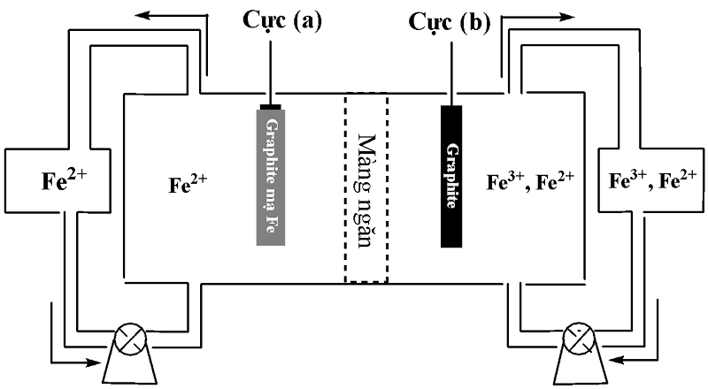 Câu 17. Pin dòng chảy (ở trong tiếng Anh gọi là Flow battery) là loại pin cho phép người dùng có thể sạc lại nhiều lần, là một phương pháp không độc hại lưu trữ đủ năng lượng sạch để sử dụng khi mặt trời không chiếu sáng. Nguyên lý hoạt động của pin dòng chảy oxi hóa khử sắt (IRFB) được mô tả như hình vẽ dưới đây: