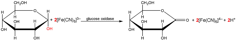 - Khi một giọt máu cho lên dải thử được phủ một lớp enzyme glucose oxidase (GOx) và chất trung gian [Fe(CN)6]3–, xảy ra phản ứng theo sơ đồ 1: