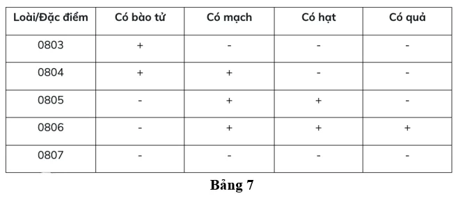 Câu 1. Bảng 7 thể hiện sự có (+) hoặc không có (-) một số đặc điểm ở 5 loài (được kí hiệu từ 0803 đến 0807). Loài nào có quan hệ họ hàng gần nhất với loài 0807?