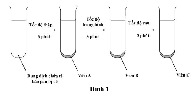 Câu 1: Các nhà khoa học tiến hành tách ti thể từ tế bào gan động vật. Tế bào này được phá vỡ trong dung dịch đẳng trương, làm lạnh bằng đá nhằm bảo toàn cấu trúc các bào quan. Dịch tế bào được ly tâm với các mức tốc độ khác nhau để tách riêng các bào quan. Sơ đồ Hình 1 cho thấy các bước ly tâm liên tiếp ở tốc độ thấp, trung bình và cao, tạo ra các viên kết tủa A, B và C trong ống nghiệm. Biết rằng: ly tâm tốc độ thấp giúp lắng các mảnh tế bào lớn, ly tâm tốc độ trung bình giúp lắng các thành phần kích thước trung bình, ly tâm tốc độ cao giúp lắng ribosome và các thành phần nhỏ khác.