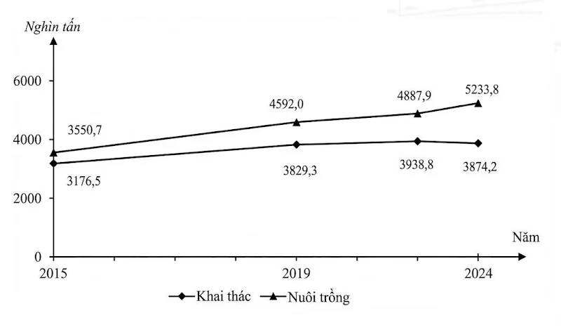 Biểu đồ thể hiện sản lượng thuỷ sản của nước ta giai đoạn 2015 - 2024