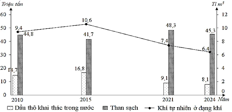 D. Từ năm 2010 đến năm 2024, sản lượng dầu thô khai thác trong nước giảm chậm hơn khí tự nhiên ở dạng khí.