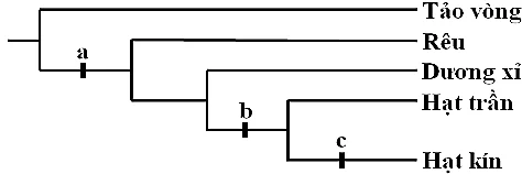 Sơ đồ Hình 10 thể hiện sự phát sinh các nhóm thực vật chính. Mỗi kí hiệu a, b, c tương ứng với một sự kiện tiến hóa trên.