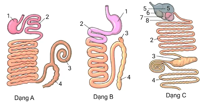 Câu 1: Dưới đây là dạng ống tiêu hóa của 3 loài động vật: