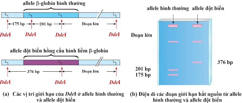 a) Allele β-globin bình thường sau khi cắt bằng DdeI tạo ra hai mảnh DNA có kích thước 175 bp và 201 bp.