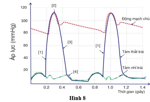 Câu 1. Hình 8 thể hiện áp lực thay đổi trong động mạch chủ, tâm thất trái và tâm nhĩ trái xảy ra đồng thời trong chu kỳ tim ở động vật có vú. Các số (1 đến 4) chỉ ra các giai đoạn khác nhau trong một chu kì tim.
