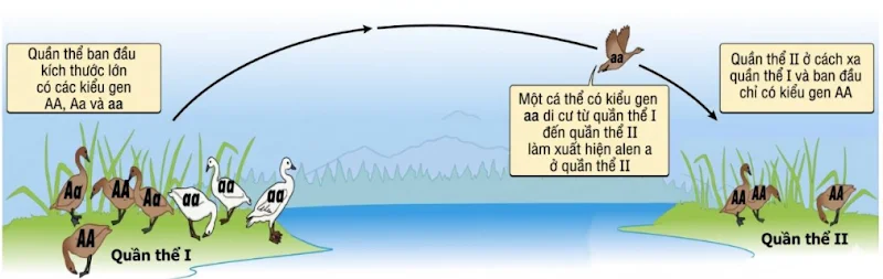 Câu 1: Hình dưới đây mô tả 2 quần thể cùng loài (quần thể I và quần thể II) sống ở 2 bên bờ sông. Xét 1 gene có 2 allele A và a (kiểu gene của tính trạng đang xét ở mỗi cá thể được kí hiệu tương ứng trên thân).