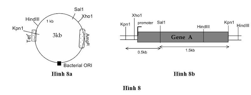 Câu 1. Một nhà nghiên cứu tiến hành thí nghiệm nhân dòng Gene A vào plasmid của vi khuẩn E. coli (Hình 8a). Plasmid có kích thước 3 kb mang: gene kháng ampicillin (AmpR); Gene kháng tetracycline (TetR); Vùng khởi đầu nhân đôi (Bacterial ORI); Các vị trí nhận biết của enzyme cắt giới hạn gồm: Kpn1, HindIII, Sal1 và Xho1. Trong đó, vị trí cắt của Kpn1 và Sal1 cách nhau 1 kb. Gene A có chiều dài khoảng 2 kb và cũng chứa các vị trí nhận biết của các enzyme nói trên (Hình 8b).