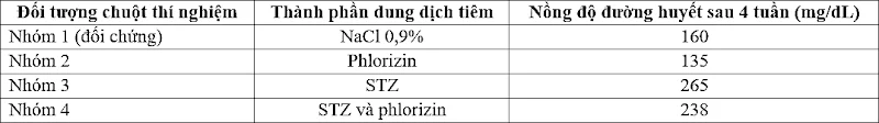 Câu 1. Một nhà nghiên cứu tiến hành thí nghiệm nhằm xác định ảnh hưởng của phlorizin lên một số chỉ số sinh lý máu, nước tiểu của chuột bình thường và chuột đái tháo đường do streptozotocin (STZ), một chất ức chế tín hiệu insulin của tế bào đích. Phlorizin ức chế protein SGLT2 là một kênh giúp tái hấp thu glucose ở thận. Bố trí thí nghiệm và kết quả sau 4 tuần được thể hiện ở Bảng 2 bên dưới. Biết rằng các nhóm chuột có chế độ ăn như nhau và uống nước theo nhu cầu và ngưỡng glucose của thận ở chuột thí nghiệm là 200mg/dL.