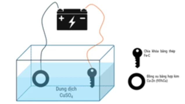 Câu 1. Một nhóm học sinh muốn sử dụng phương pháp điện phân để mạ đồng (copper) cho chiếc chìa khóa làm bằng thép (hợp kim Fe-C). Nhóm học sinh đã lấy một đồng xu bằng hợp kim Cu - Zn (trong đó Cu chiếm 95% về khối lượng). Chuẩn bị dung dịch điện phân là 300mL dung dịch copper (II) sulfate 0,5M.