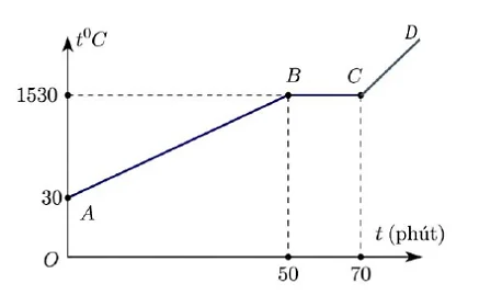 Câu 1. Người ta dùng một lò hồ quang điện để nấu chảy một khối kim loại nặng 20 kg. Biết lò hồ quang truyền nhiệt cho khối kim loại với công suất không đổi là 5000 W. Sự thay đổi nhiệt độ của khối kim loại được ghi lại theo thời gian như hình bên dưới.