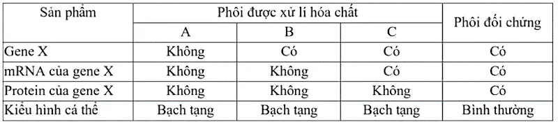 Người ta tiến hành xử lí các phôi bằng từng loại hóa chất riêng biệt. Kết quả thu được ở bảng sau (Phôi đối chứng không được xử lí hóa chất).