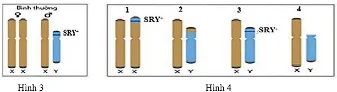 Câu 1. Ở người, trên cánh ngắn của NST Y có gene SRY (sex-determining region Y gene) quy định giới tính nam. Vì vậy, giới tính được quyết định bởi việc có hay không có NST Y mang vùng gene ; Hình 3 mô tả 2 cặp NST giới tính (XX và XY) ở người bình thường. Một người nhìn bề ngoài là nam nhưng khi xét nghiệm NST bác sĩ nói rằng bản thân họ là nữ về mặt di truyền. Người đó có thể có cặp NST nào trong số 4 cặp NST giới tính ở Hình 4?