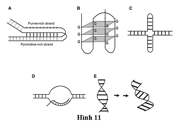 Câu 1. Trong điều kiện sinh lý đặc biệt (khử nước, nồng độ muối cao.... tại các vùng trình tự đặc biệt của DNA (như vùng lặp lại, vùng giàu G, hoặc trình tự đối xứng......), phân tử DNA có thể tạm thời chuyển đổi sang các cấu trúc hình học khác Hình 11. Các nghiên cứu di truyền học hiện đại đã chỉ ra rằng những cấu trúc này không chỉ là những "biến dạng" ngẫu nhiên mà còn là tác nhân chính gây ra sự kém bền vững của hệ gene, đây một trong những nguyên nhân hàng đầu gây ra các bệnh ung thư và hội chứng di truyền.