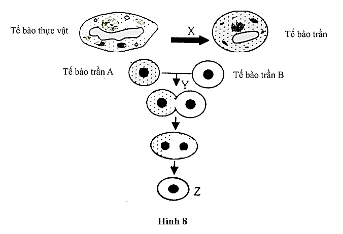 Câu 1. Trong phòng thí nghiệm công nghệ sinh học thực vật, người ta muốn tạo cây lai soma giữa hai tế bào thực vật khác loài A và B ở hình 8 để kết hợp các đặc tính mong muốn mà lai hữu tính khó thực hiện được. Quy trình gồm các bước chính: từ tế bào thực vật loại bỏ thành tế bào để thu tế bào trần (enzyme X có thể là cellulase và pectinase), sau đó cho tế bào trần A và tế bào trần B dung hợp (chất Y có thể là PEG- (polyethylene glycol) tạo tế bào có 2 nhân, sau đó 2 nhân kết hợp với nhau để hình thành tế bào lai Z, nuôi cấy tế bào này để tái sinh thành cây lai hoàn chỉnh.