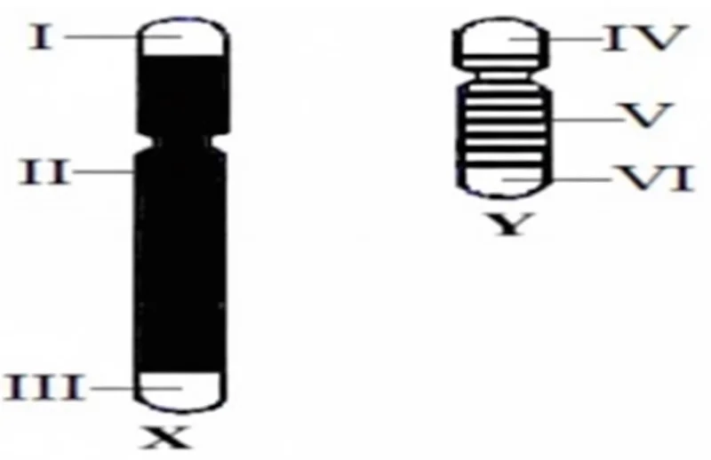 Câu 10. Các vùng trên mỗi nhiễm sắc thể của cặp nhiễm sắc thể giới tính XY ở người được ký hiệu bằng các chữ số La Mã từ I đến VI như hình bên dưới. Trong cặp nhiễm sắc thể giới tính này, vùng tương đồng giữa nhiễm sắc thể X và nhiễm sắc thể Y gồm các vùng nào sau đây?