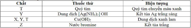 Câu 10. Kết quả thí nghiệm của các dung dịch với thuốc thử được ghi ở bảng sau: X, Y, Z, T lần lượt là A. Ethylamine, glucose, saccharose, a...