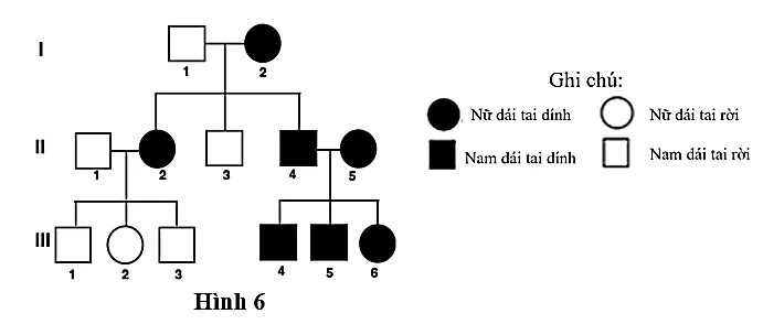 Câu 12: Phả hệ Hình 6 theo dõi sự xuất hiện tính trạng hình dạng của dái tai dính qua các thế hệ trong một gia đình. Biết tính trạng này do gene lặn nằm trên nhiễm sắc thể thường. Nếu cá thể III-6 kết hôn với một người đàn ông đồng hợp trội về dái tai rời, dự đoán nào sau đây là đúng nhất đối với các con của họ?
