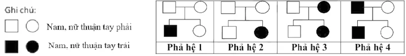 Câu 13. Ở người, tính trạng thuận tay phải là trội hoàn toàn so với tính trạng thuận tay trái. Một gia đình có bố, mẹ thuận tay phải sinh ra hai người con, trong đó có một người con trai thuận tay trái. Phả hệ nào sau đây phản ánh đúng sự di truyền tính trạng tay thuận ở gia đình này?