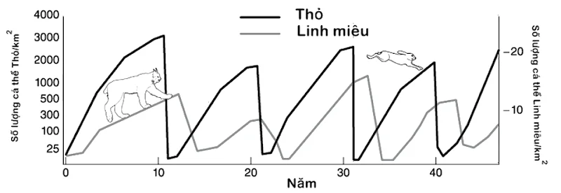 Câu 13: Sơ đồ ở hình bên mô tả sự biến động số lượng cá thể của quần thể thỏ và quần thể linh miêu. Đây là ví dụ minh họa cho kiểu biến động số lượng cá thể nào sau đây?
