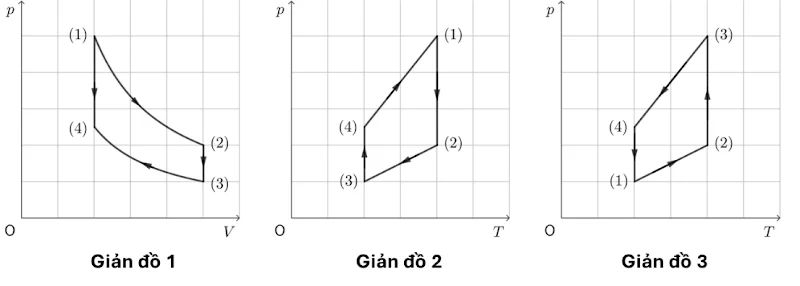 Câu 14. Cho 3 giản đồ mô tả chu trình biến đổi trạng thái của cùng một lượng khí lí tưởng như trên hình vẽ. Biết rằng các quá trình bên tron...