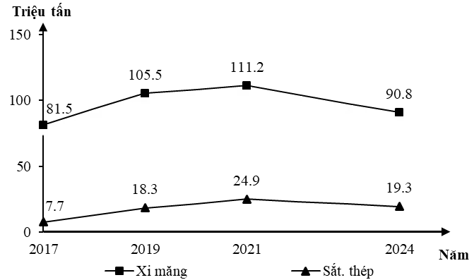 Câu 15. Cho biểu đồ sau: Biểu đồ thể hiện nội dung nào sau đây? A. Quy mô sản lượng xi măng và sắt, thép của nước ta. B. Quy mô và cơ cấu sả...