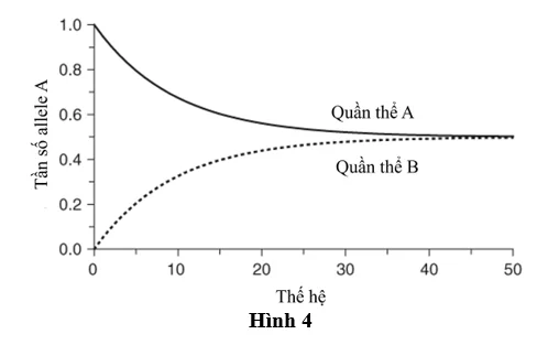 Câu 15: Hình 4 cho thấy hai quần thể A và B ban đầu có tần số allele khác nhau, nhưng qua nhiều thế hệ, do có sự trao đổi cá thể giữa hai quần thể, tần số allele của chúng dần xích lại gần nhau và đạt trạng thái cân bằng.