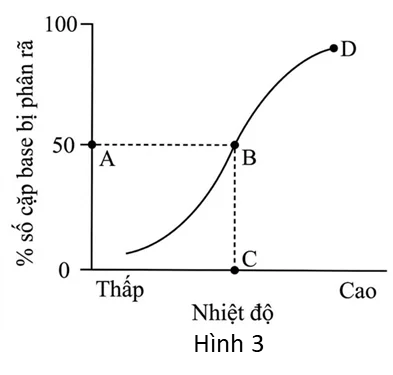 Câu 15. Nhiệt độ nóng chảy của DNA (Tm) là nhiệt độ mà tại đó phân tử DNA có 50% mạch kép bị tách hoàn toàn thành 2 mạch đơn. Đồ thị trong Hình 3 thể hiện mối quan hệ giữa các liên kết hydrogen giữa các cặp nucleotide trong mạch DNA kép phù hợp với nhiệt độ. Nhận định nào dưới đây là đúng?