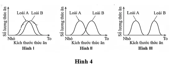Câu 15. Sơ đồ mô tả ổ sinh thái về kích thước thức ăn của 2 loài A và B được thể hiện ở hình I,II và III bên dưới. Loài A và loài B sẽ không cạnh tranh nhau về thức ăn khi ổ sinh thái về kích thước thức ăn của 2 loài được thể hiện ở hình nào?