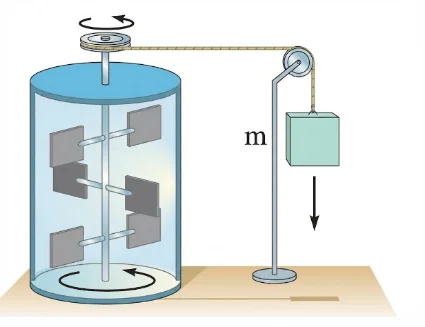 Câu 15. Thực hiện một thí nghiệm đơn giản về quá trình chuyển hóa cơ năng thành nhiệt năng như hình vẽ. Biết quả nặng sử dụng có khối lượng 20 kg và bình chứa 1,5 kg nước. Cho nhiệt dung riêng của nước là 4186 J/(kg.K) và gia tốc trọng trường là 9,8 m/s2. Coi như toàn bộ cơ năng của quả nặng được chuyển hóa thành nhiệt năng của nước bên trong bình. Để nhiệt độ nước trong bình tăng thêm 53 mK thì quả nặng phải đi xuống một quãng đường tối thiểu là