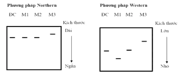 Câu 16: Có 3 loại đột biến xảy ra ở cùng một gene, ký hiệu các thể đột biến này lần lượt là M1, M2 và M3. Để xác định các dạng đột biến trên thuộc loại nào, người ta dùng phương pháp Northern (phân tích RNA) và Western (phân tích protein). Kết quả phân tích mRNA và protein của các thể đột biến và kiểu dại (ĐC) bằng hai phương pháp trên thu được như hình bên.